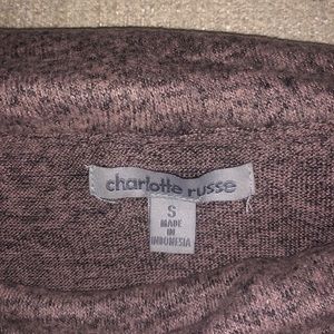 Long sleeve shirt, lavender type color. Not solid color, it has a texture pattern to it-with black speck patterns similarly. Neckline folds over, as if it’s a built-in scarf. Very warm material. Can be worn by itself with nothing under, and a jacket or coat over it.