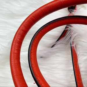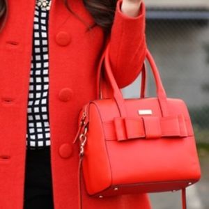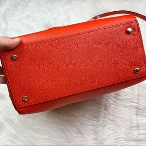 Kate Spade the Alice Court Kaiya bow satchel in a gorgeous orange color with hot pink lining. Color is Empire Red. Smooth cowhide leather with matching trim and custom woven lining. 14 karat light gold plated hardware. Top handle with removable crossbody strap and zip closure.