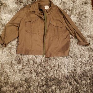 dark olive green, front zip closure, long sleeve, and two pockets. Would go great with black or blue jeans. Also could go for business casual or everyday wear.