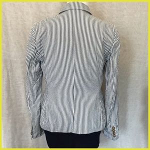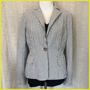 Size 4 pinstripe/seersucker type material/style, one button blazer by MICHAEL Michael Kors in gently pre-loved condition. Faux pockets on the front. Dress it up with white pants or toss it on over a light and flowy summer dress!! Very versatile! •I’m open to fair offers and negotiations on all items!•