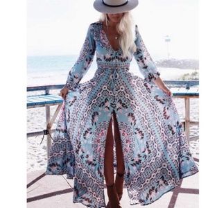 Boho Chic Gypsy Floral Print Maxi Dress blue