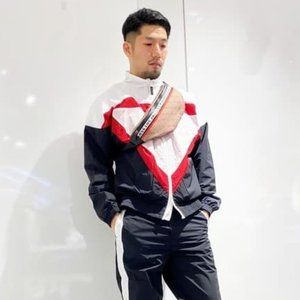 A windbreaker with a simple design but a bold color scheme and a sharp triangle line.