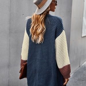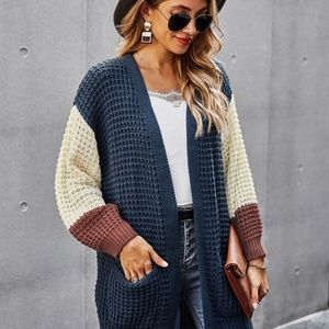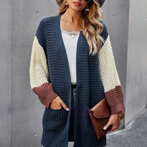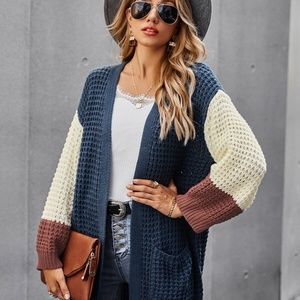 Color block chunky knit pocket open front cardigan