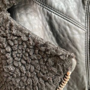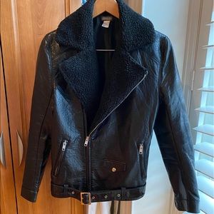 Oversized biker jacket with faux fur collar. Diagonal zipper. Faux leather. Some wear at the edges of collar. Zipper stick a tiny bit when starting.