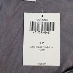 New With Tags. Boston Proper dressy elegant zebra sequin velvet dress in gray size 12. Scoop neck, long sleeve and cocktail length. The front has zebra patterned sequins and the back is solid velvet.