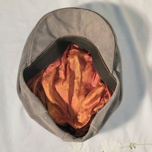 Vintage gray suede newsboy cap gatsby beret, English sportscar driver hat. Lined in burnt orange. No brand or size tag. Measures approx 54 centimeters around at inside band. Lining seam separating in short places (shown). No other obvious flaw or damage.