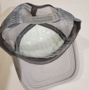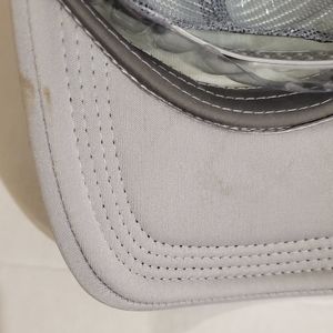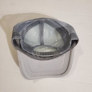Features: New with out tags. Minor flaw. Small stain on the inside of the lid of the hat. Gray and white. Adjustable strap in the back/mesh detail. Unisex