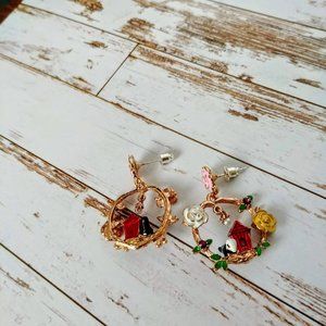 Trendy floral hoop earrings in gold tone. Hand painted enamel, crystal, and faux pearl accents with post packs. Colorful, cute, and collectible.