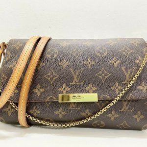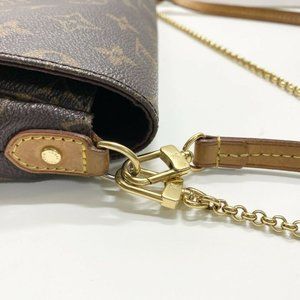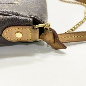 The Favorite MM clutch in monogram canvas can be carried by hand or on the shoulder thanks to its removable leather strap and golden color chain. It opens up to reveal a beautiful beige lining. Comes with dustbag. Leather aging, hardware tarnish, stains.