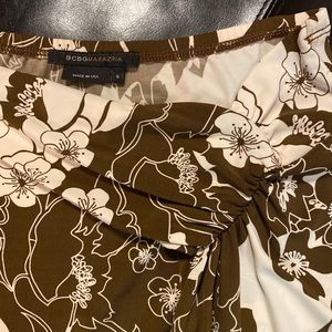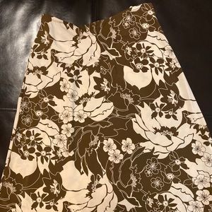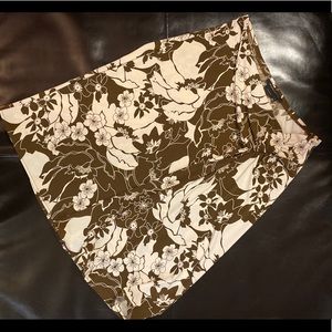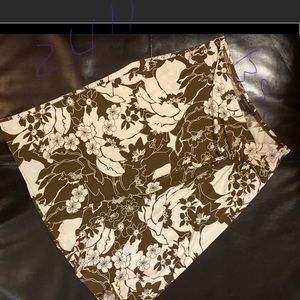 Good used condition. Cute, cool floral print material, brown and creme color. Has a cute scrunch at the top for a unique look. Wrap around style so the slit opens by the front left side of the leg but it overlaps about 5” from the bottom of the rouching to 18” that falls like in the picture