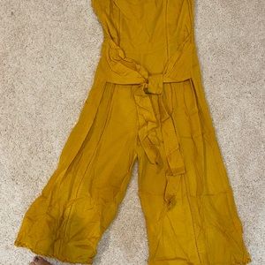 Never worn, yellow strapless Tularosa jumpsuit bought from Revolve. Size medium, good for a bustier medium. Super cute, great for a wedding or dinner with friends! Reason the photo is listed in Euros (I bought it studying abroad). Original price converted to US dollars.
