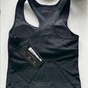 Features internal bra with removable bust cups, longer length silhouette, and rose gold foil logo.