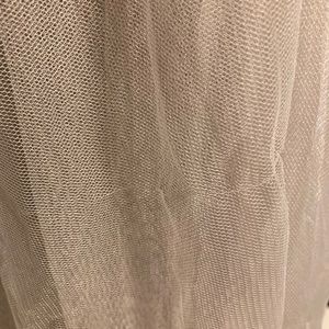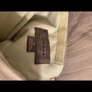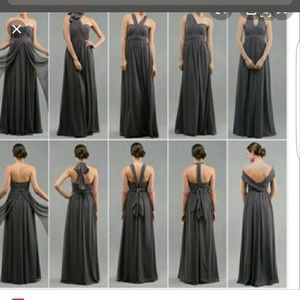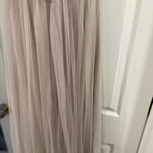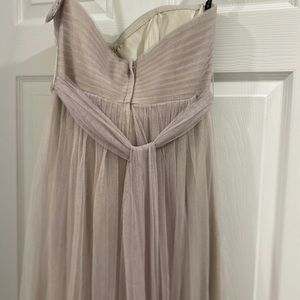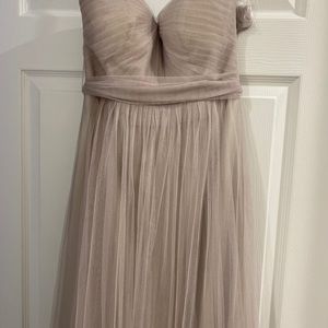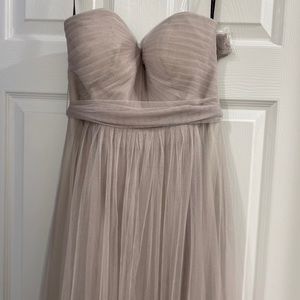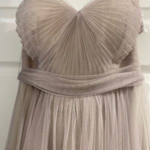 Strapless bodice with a sweetheart neckline. Floor length gathered A-line skirt features convertible panels that can be used to create alternate necklines and strap details. A detachable tulle sash that can be used to tie around the waist to create definition and finish the look is included. **slight imperfection at bottom - see pic**