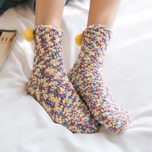 These socks are perfect for the cold weather! They are made of polyester and are yellow, blue, pink, white.