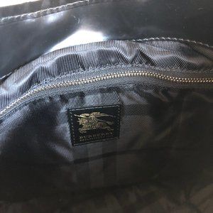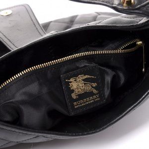 Burberry quilted black nylon hobo bag with leather strap, leather cross-over snap closure and leather base.