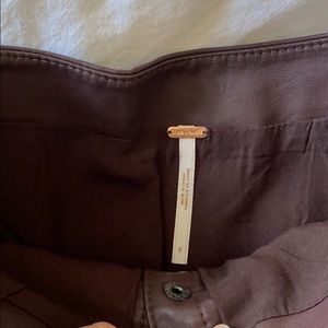 This is a Free People pleather mini skirt in a pretty maroon/burgundy color. Has a button detail all the way up. Very comfortable skirt with a little stretch and would look great for the holidays! I normally wear a 27/28 in denim, but this skirt is a size 6 and fits perfectly.