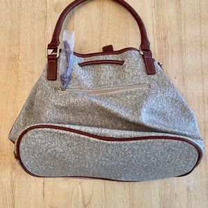 Legacy purse, includes detachable shoulder strap. Body of purse is tan/oatmeal color. Leather trim is brown.