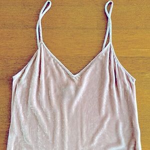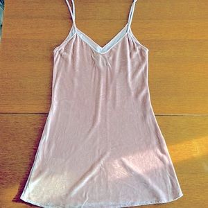 This is an easy fitting, mini length dress with a v neckline and an open upper back. Size medium. Blush color. In good used condition. The dress measures 19 inches at the bust and 35 inches long.