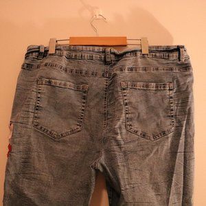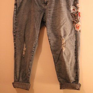 Super cute floral embroidered ripped jeans. In great pre-loved condition, some balling (see photos). Stretchy jegging material, can be worn cuffed or not, acid wash type style.