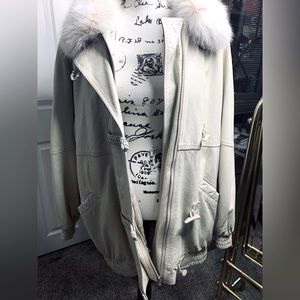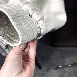 Shimmery cream leather exterior with removable fur collar & inner lining