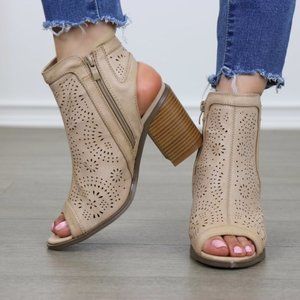 Taupe Laser Cut Design Open Toe Ankle Boots