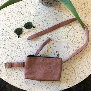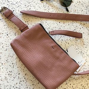 This soft pink, clay-colored belt bag / fanny pack can double as a wristlet, clutch, or makeup bag!