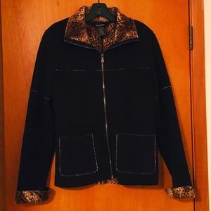 A rare vintage 90's treasure splurged on by my Aunt while browsing boutiques when she was vacationing in the Florida Keys, this chic jacket will keep you warm in style! Great for cooler weather and heavenly soft this unique jacket is black with leopard trim. It has a front zip and 2 front pockets. Size Large (see pictures for exact measurements), beautiful condition, and from a smoke/pet free home.