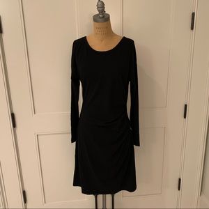 95% wool 5% elastane. long sleeved. crew neck. ruching on left hip. midi length. stretchy. like new.