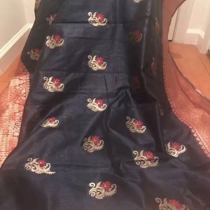 An elegant rich look Midnight Blue Banarasi Silk Saree with Maroon & Golden Zari Border. Floral motifs woven all over in light golden zari. Comes with a matching blouse piece. Fall/ pico done. Perfect for festivals n parties. The saree isn’t soft n free flowing. It’s little stiff but with wear it might soften.