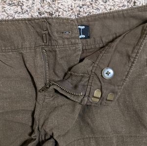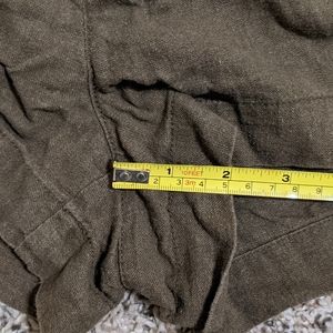 Dark olive green shorts, material is a linen blend, zipper/double tab closure, 2" rise, usable front and back pockets, tab-button detail at sides of waist, Size S, selling bc too small for me now 🤷🏻♀️