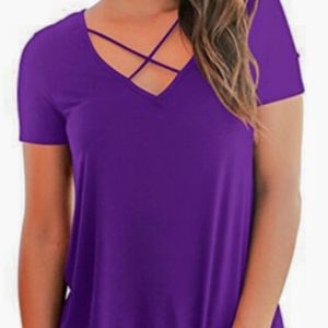 Ladies Purple Criss Cross V-Neck Top. Size Large. This cute trendy top measures approximately 20" inches from pit to pit & approximately 29 1/2" inches long from back collar down./