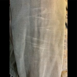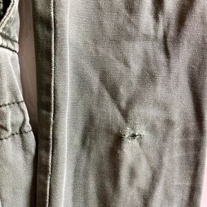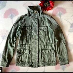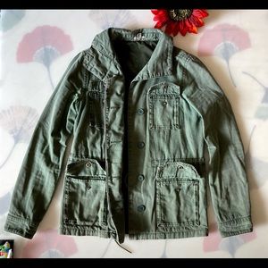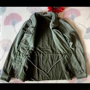Comfortable Olive military jacket. Button down front with cargo pockets and an cinched waste. It has a small hole on the left sleeve, you can see it on the photo.