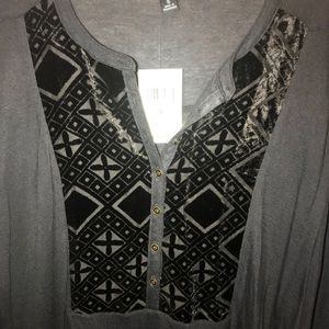 NWT Cute velvet cut out patterned front panel long sleeved top. Semi-sheer, 100% Rayon, machine washable. Sleeves can be rolled and buttoned up or left down (see all photos).