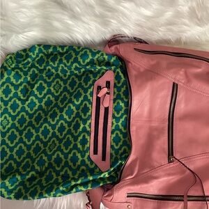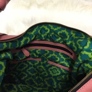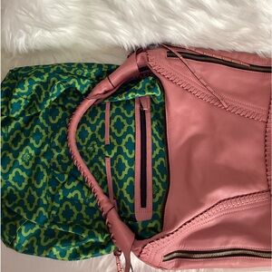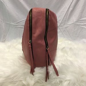 OrYANY Expandable Leather Hobo bag. Soft leather with whipstitch and studded tassel details, brass tone hardware, top zip closure with leather pull, leather braided shoulder handle, with tassel drops, double sides expandable zippers, back zip pocket with tassel pull. Interior is lined with signature green fabric and has double zip, cellphone and multi-function slip pockets. Approx. measurements: 15"L X 12"H X 3.5"D