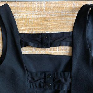 Square neckline and cut-out back detailing with button and zip closure at back.