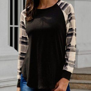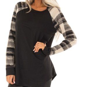 Chic & super soft long sleeve shirt with solid black body and super trendy black & ivory plaid sleeves. Stylish round neck & hemline. Loose fit & gorgeous look for this Winter! Limited Stock. 95%polyester+5%spandex. See size chart in pictures.