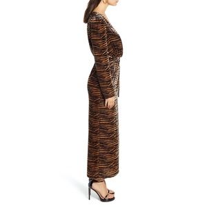 A plush velvet maxi dress patterned in protectively fierce tigress stripes features a trendy wrap silhouette.