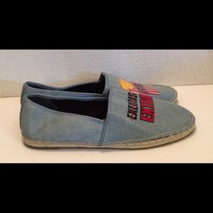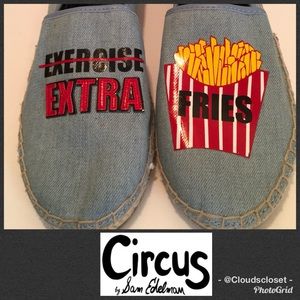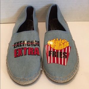 EXERCISE...... NO EXTRA FRIES... Sam Edelman brings humor to our comfy feet Espadrilles... Medium Denim color, goes w/ everything from jeans, shorts, to swim suit and resort... VGUC Comfy and will always get a laugh SIZE 9❤️