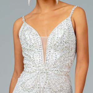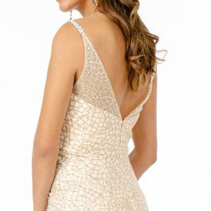 Long Formal Evening Dresses with illusion v-neckline, sequin dress, open v-back with zippered closure, mermaid shape.