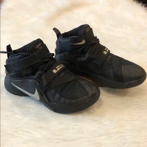 Black Nike Lebron 9. Size 5. Used condition. Has small frays on the top of the shoe. Still good condition.