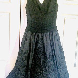 Elegant, flattering vintage style dropped, ruched bodice with gorgeous black appliqué on skirt. Simple yet fancy black dress for any occasion. Very Audrey Hepburn. Skirt is finely lined. Tule for flounce at lining bottom. Gently used in great condition Size 10. Audrey Hepburn would have worn this, very 50's