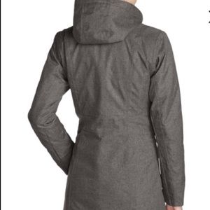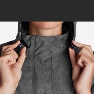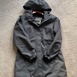 NWT Eddie Bauer Insulated Weatheredge Trench Coat. Dark charcoal color. Water repellant with a hood. Synthetic insulation. Internal drawstring waist. 2 zippered pockets.