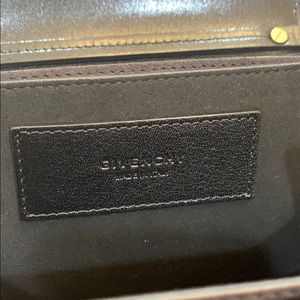 Givenchy small black purse with a cute gold chain to hold that’s perfect for a night out! Dark grey suede material on the sides of the front and on inside. Lots of space inside to hold all of your things. No crossbody strap. 6 1/2 in. top to bottom and 9 In. across. New.