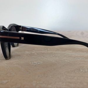 These luxurious glasses by Valentino are the ultimate accessory! Made in Italy, the sizing is 51-22-140mm (eye-bridge-temple). The frames are made of acetate and the lens is plastic. The lens color is gray radiant and provides 100% UV protection.