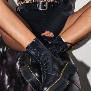 “The original Dr. Martens 8-eye boot is reimagined with a bold chunky platform but stays true to the classic style featuring an iconic rubber air-cushioned sole and yellow stitching.”