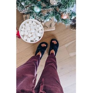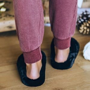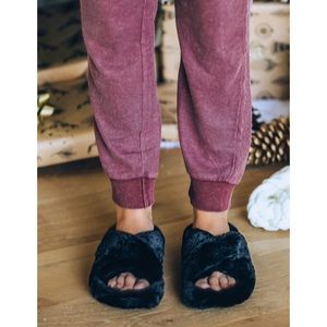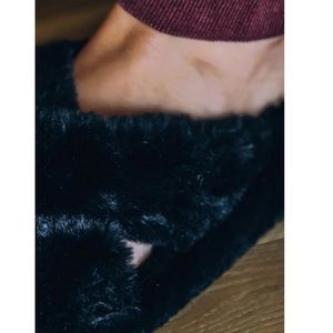 Black faux fur slipper slides crisscross straps