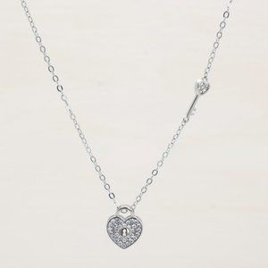 This is a cute little design with a heart and a key on the same chain. The key can move up or down depending on how you move the chain. It is made of sterling silver, stamped s925. Both the ring and the heart have multiple zirconias that glisten beautifully in light.