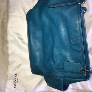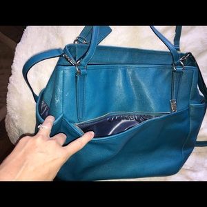 Beautiful leather coach diaper bag, can double as large bag, but with pockets to hold all diaper or everyday essentials. With adjustable cross body strap.