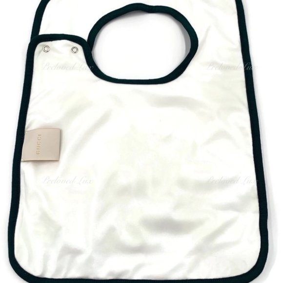 Authentic Gucci White/Green Baby Bib infant. Size: 9.25" X 13". Comes with Box - stains on ribbon and box noted. Beautiful Gucci Baby Bib. Small stain that is not noticeable - see photo. No major damage. We are not accepting offers.