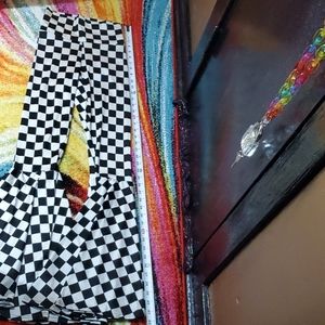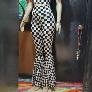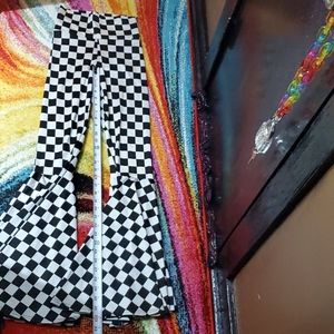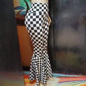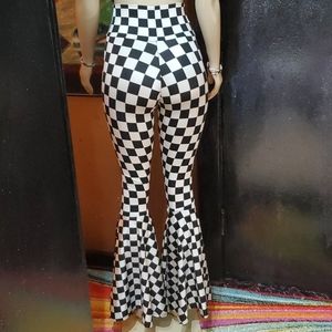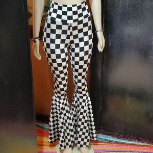 Checkered bell bottom pants. Nice material that gives you a firm hold. Comfortable fit. Some stretch. Wear high waisted. Or you can flip the top of the pants down.